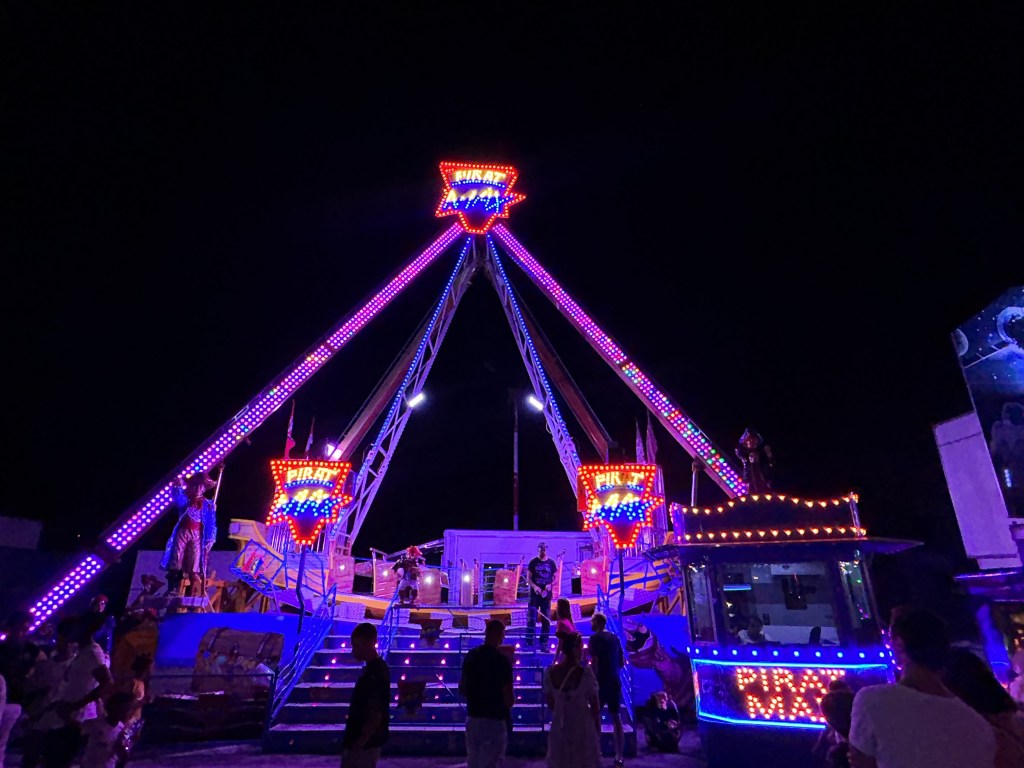 Le bateau pirate, une attraction qui imite le mouvement d’un bateau sur les vagues. Les passagers sont assis dans des sièges et sont balancés d’avant en arrière, créant une sensation de bascule et d’aventure en mer.